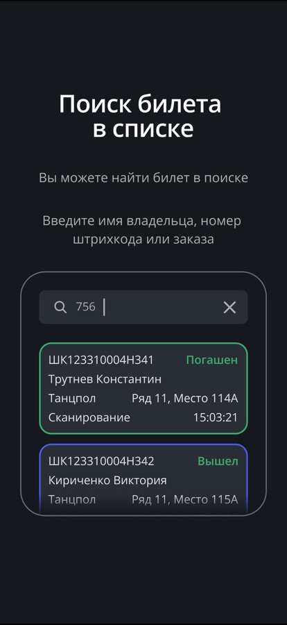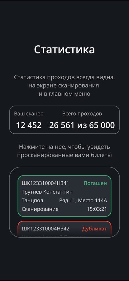 Приложение сканирует QR и штрих коды, размещенные на билете посетителя и выявляет его статус.