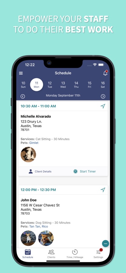 The Time To Pet mobile application is a companion app for pet sitting and dog walking companies registered with Time To Pet. The app can be used by both staff members and clients to supplement their pet sitting software.