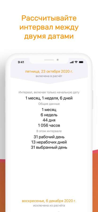 • Узнавайте точное количество рабочих дней, нерабочих и выбранных вами дней недели между двумя датами.