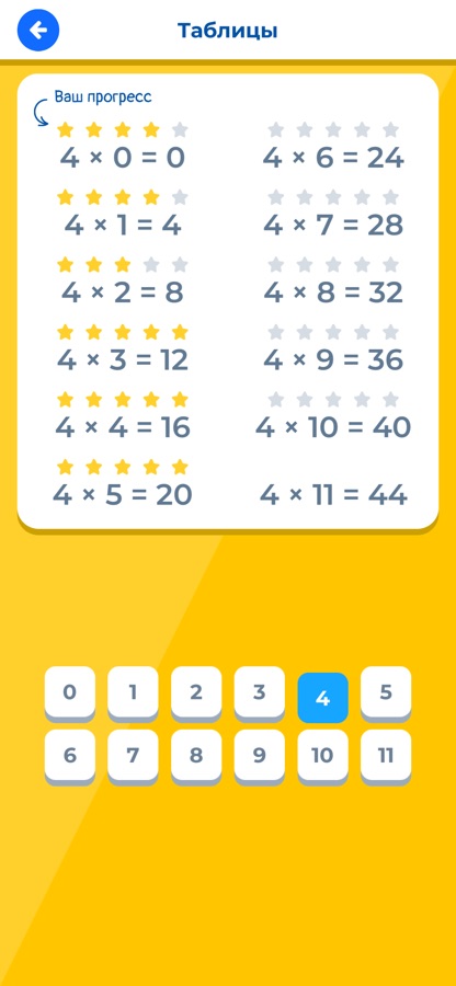 * Процесс обучения отображается с помощью звездочек прогресса. Благодаря этому, Вы можете проверить как прогресс обучения по отдельным действиям, так и общий прогресс. Алгоритм отдельно рассчитывает прогресс для таблицы умножения и деления. Кроме того, он адаптирован к актуально выбранным диапазонам результатов, а также к диапазону цифр, использованных в действиях. Обе настройки и режим обучения можно изменять в опциях приложения.