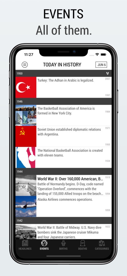 Created for History, trivia, and knowledge lovers. Get all the important events of the day or narrow your selection down to one of our specific categories: Events, Births, Deaths, Holidays, and more…