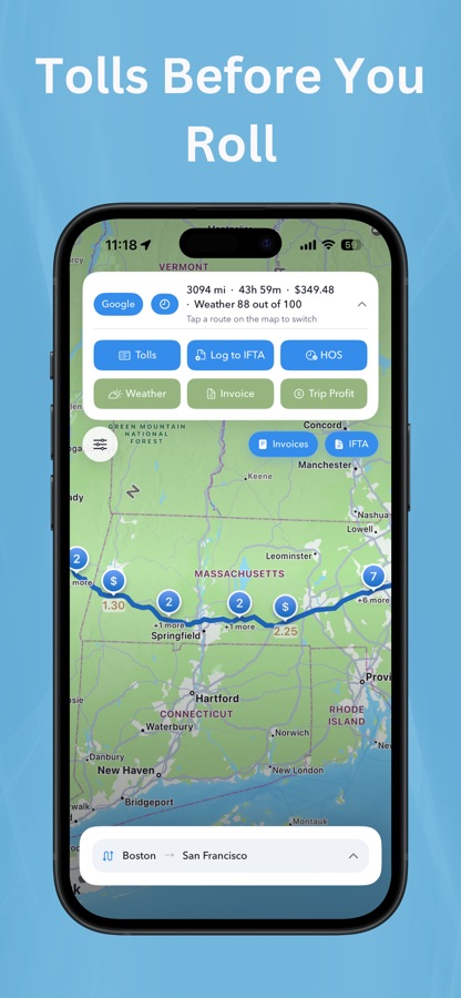 Routes are generated using Apple and Google routing services. Some routes may include roads not suitable for large commercial vehicles. Always verify road restrictions before travel. Toll rates are estimates and may vary. This app is not affiliated with any tolling agency.