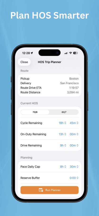 • Plan route feasibility with your current Cycle, On-Duty, and Drive clocks