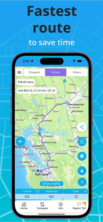 TollGuru Toll & Fuel (gas, petrol, diesel, electricity) trip calculator computes toll & cost for car, carpool, EVs, taxi, rideshare, truck, trailer, bus, RV and motorcycle. Travel on the cheapest, the fastest, and compromise routes post time and cost tradeoff.