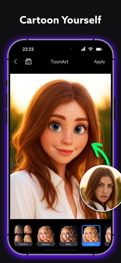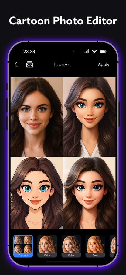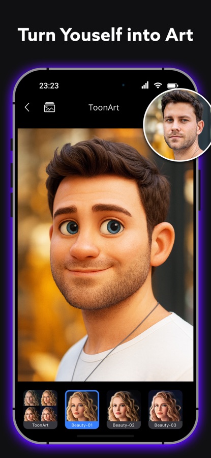 Добро пожаловать в мир ToonArt! Мощное приложение для редактирования мультипликационных фотографий, которое позволяет вам изображать себя и создавать свой аватар. Этот редактор изображений, основанный на технологии искусственного интеллекта, создает ваше любимое аниме, карикатуру или анимацию за считанные секунды. Редактируйте фотографии с помощью фильтров камеры и станьте вашим любимым 3D-мультфильмом.