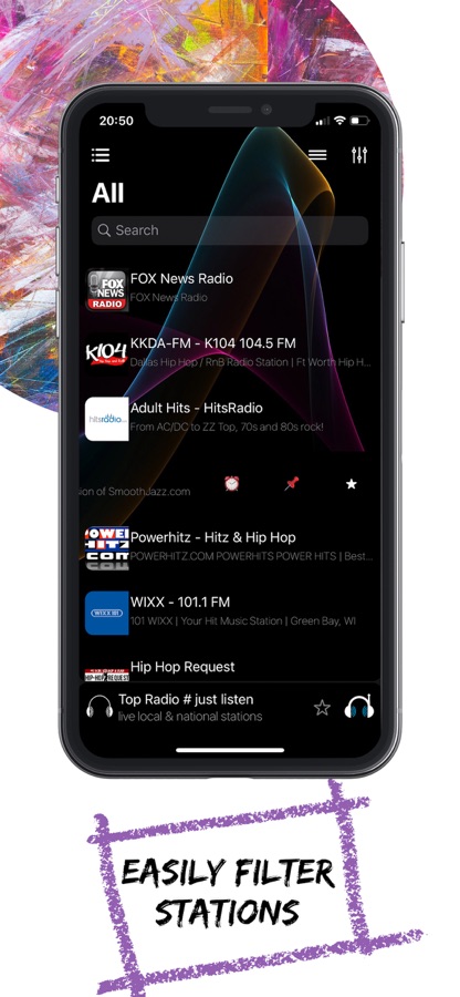 Next/Previous station from lock screen or headphones, local & national stations, clean design, ease of use, battery efficient, music, news, talk shows. All in one app!