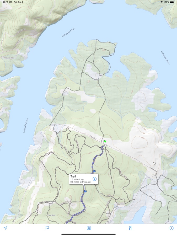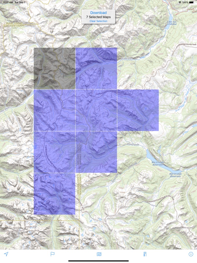 Flags are included with map downloads. Add flags (waypoints) to the map to mark your current location or other locations. Import flags from other sources using GPX files and geocache LOC files. Share flags with others using email or AirDrop. Organize your flag types by color, for example, geocaches, trailheads, and summits.