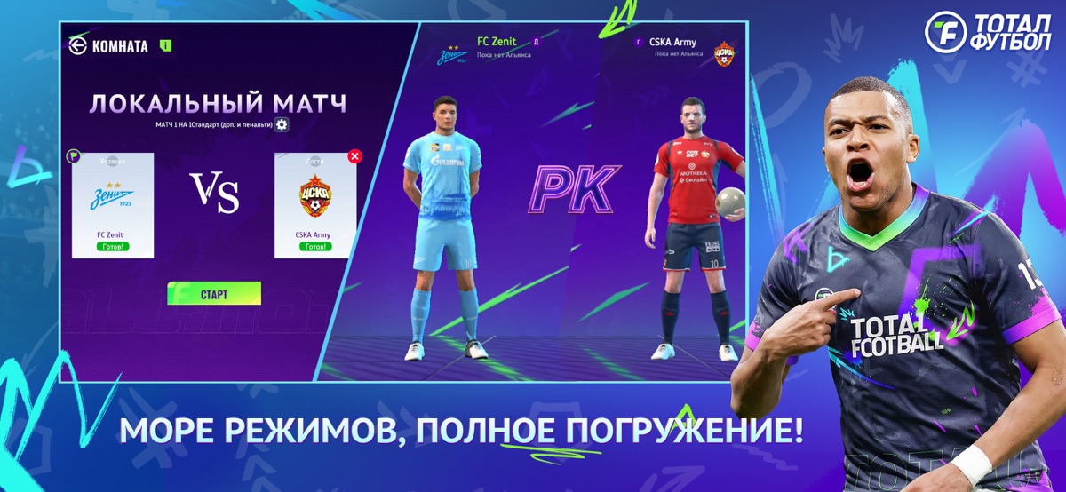 Тотал Футбол — это увлекательный соревновательный футбольный симулятор, имеющий лицензии FIFPro, РПЛ и других ведущих футбольных организаций.