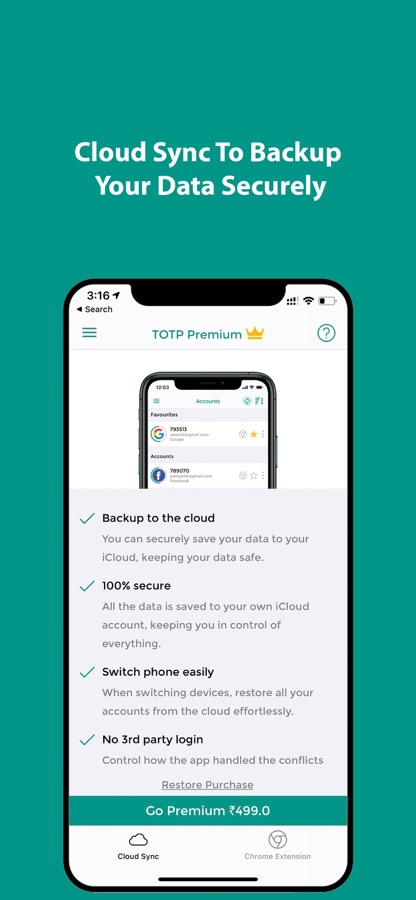 Never lose your codes again! With Cloud Sync, you can easily backup your 2FA data to your iCloud. This keeps you in total control of your data while providing effective cloud backup.