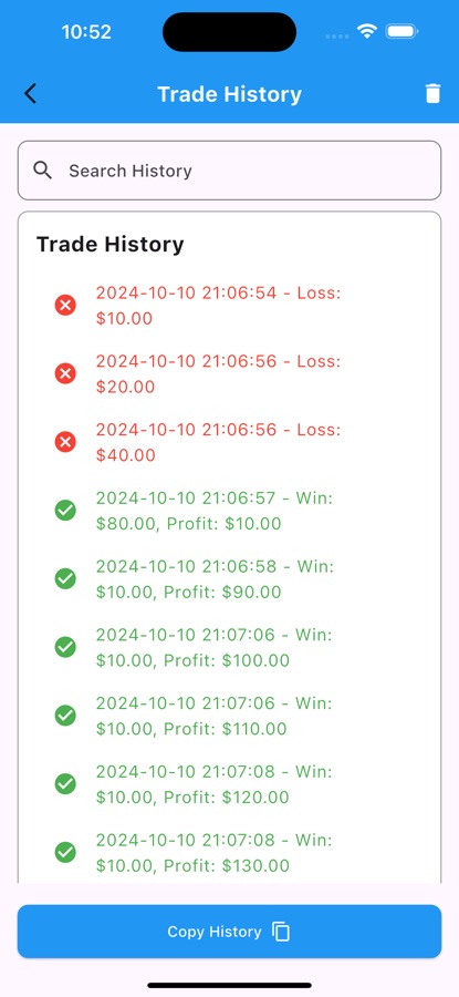 — Comprehensive Trade History: Effortlessly track every trade you make, with detailed logs showing the exact amount won or lost along with timestamps. Filter, search, and analyze your trades to fine-tune your strategy.