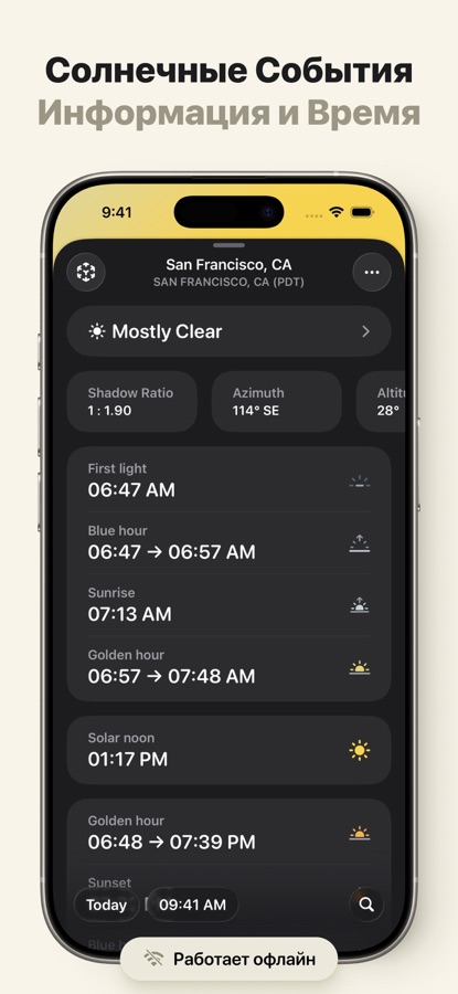 Получайте точные, актуальные данные о солнце, основанные на вашем местоположении, в любое время, даже без подключения к интернету.