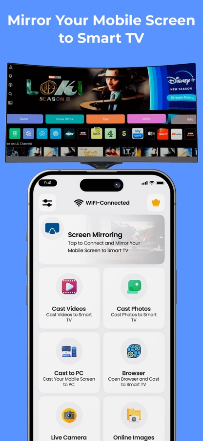 MirrorCast — это лучшее решение для трансляции экрана! Легко делитесь экраном своего телефона на телевизор, ПК или другие устройства по беспроводной сети. Наслаждайтесь бесшовной трансляцией видео, фотографий, игр и многого другого.