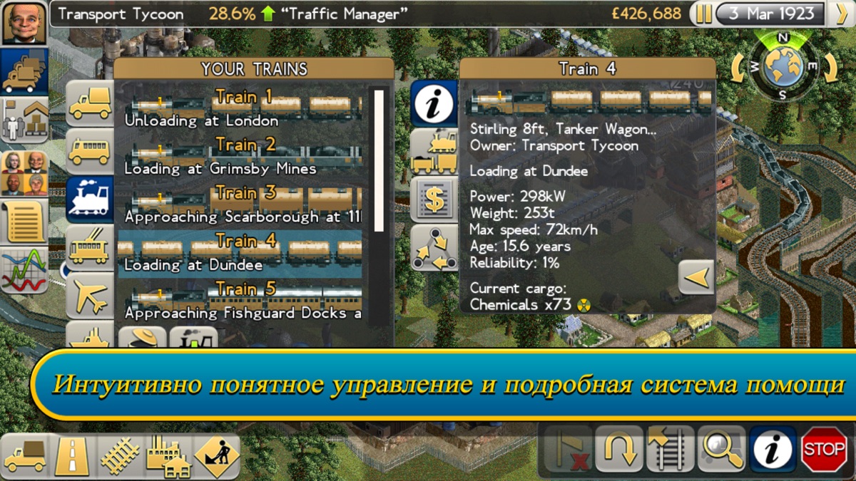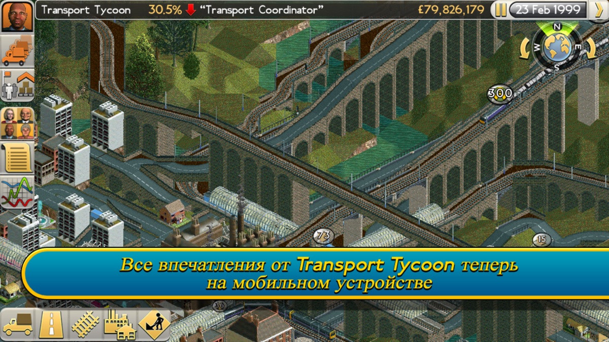 В Transport Tycoon вы найдете все лучшее из классической игры для PC, а также множество нового: большие и насыщенные карты, глубокий уровень симуляции и огромное разнообразие наземного, морского и воздушного транспорта. Интуитивно понятное управление касанием делает постройку и развитие транспортной сети простыми как никогда.
