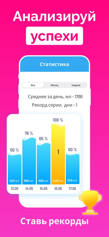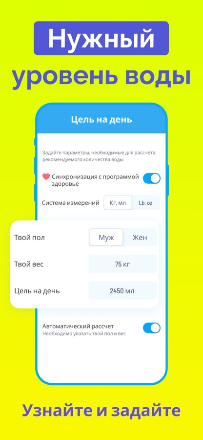 — Гибкая настройка целей – рассчитывайте норму воды по вашему весу.