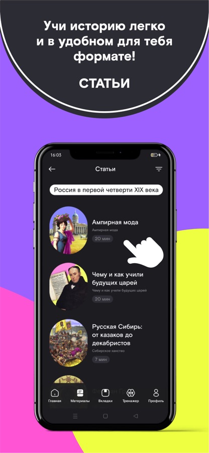 Добро пожаловать в мобильное приложение «ТРЕНАЖЕР ПО ИСТОРИИ». Вместе с нами ты можешь изучить материалы в удобном для тебя формате, подготовиться к урокам и экзаменам по русской истории. Мы собрали готовый увлекательный контент, который адаптирован к школьной программе.