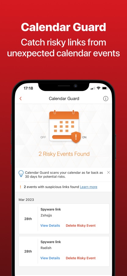 • Calendar Guard catches risky links that may have been snuck into an unexpected calendar event invite