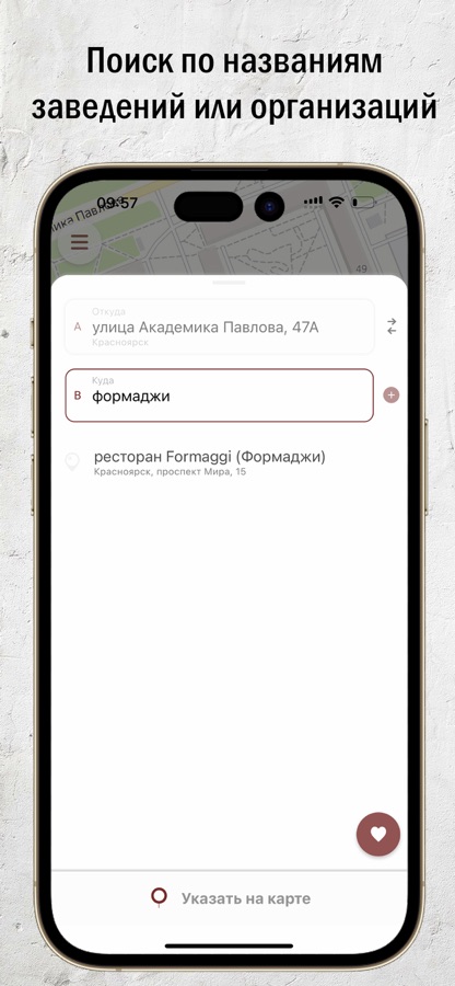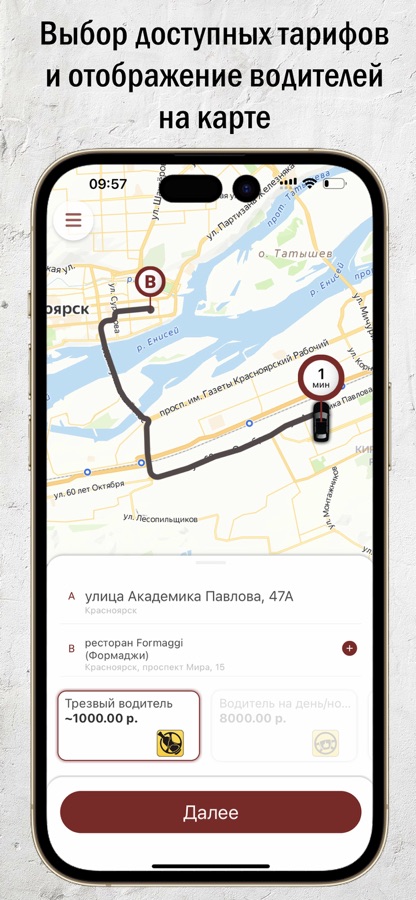 Приложение самостоятельно подберёт оптимальный маршрут с учётом плотности движения и скоростного режима в момент заказа