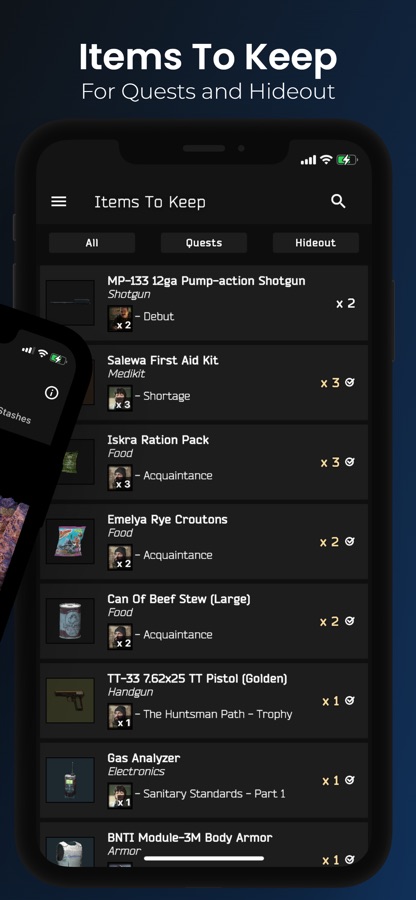 — Items to Keep: Stay prepared for future quests and hideout upgrades with a curated list of items to keep. Know exactly what items you need to hold onto for your upcoming quests & hideout upgrades.