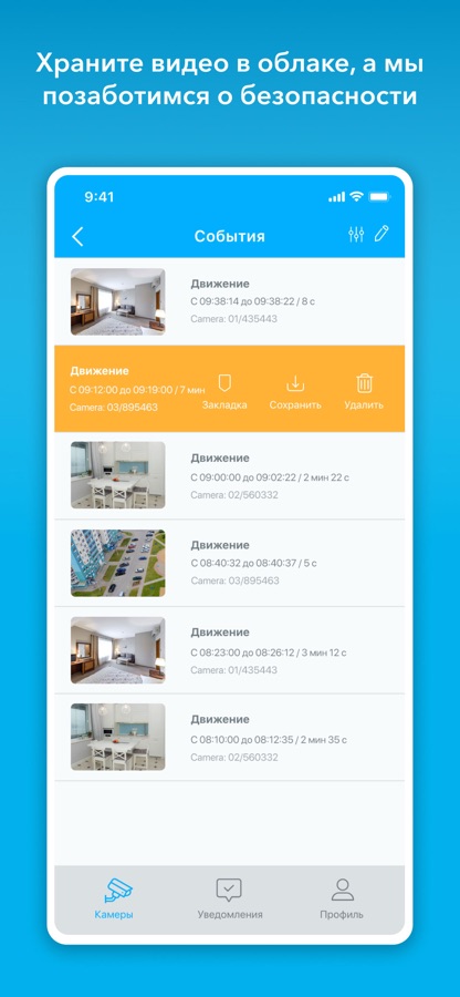 • Уведомления на смартфон при обнаружении движения и громких звуков.