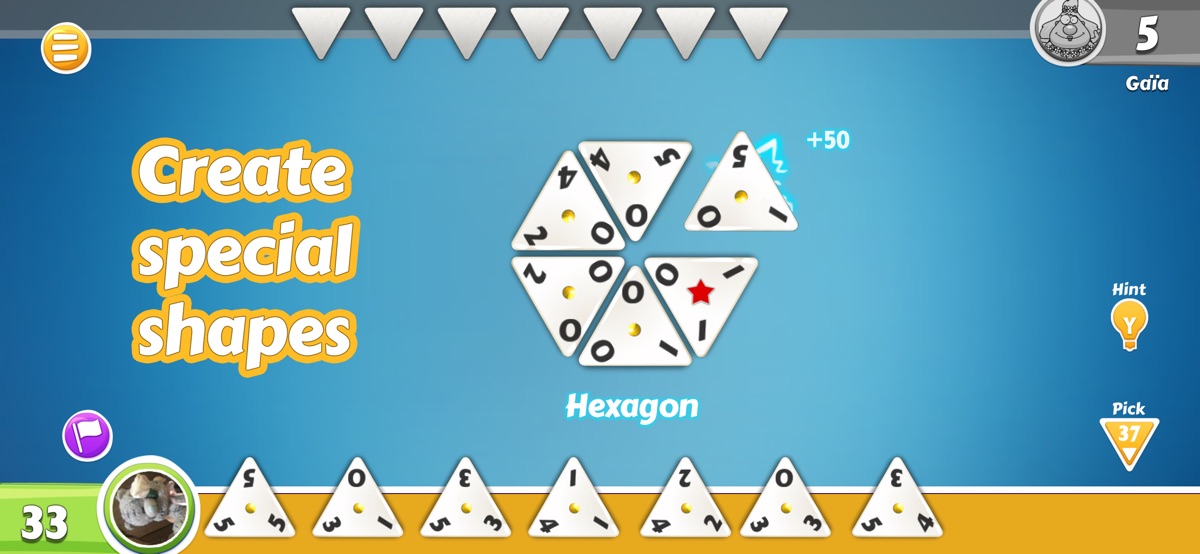 Slide your triangular tiles onto the “board,” matching one of the sides with the side of a tile that’s already in play. You’ll earn points for each tile you play, and bonus points for making combinations like a bridge, a hexagon, or a double hexagon. It’s easy to learn and quick to play—whether you sneak in quick moves while waiting in line for lunch or sit down and play for hours.