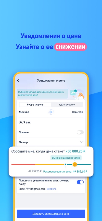 Уведомления о цене ► не можете найти авиабилеты по желаемой цене? Настройте уведомления о цене, и мы сообщим вам, когда стоимость снизится до указанной вами цены.