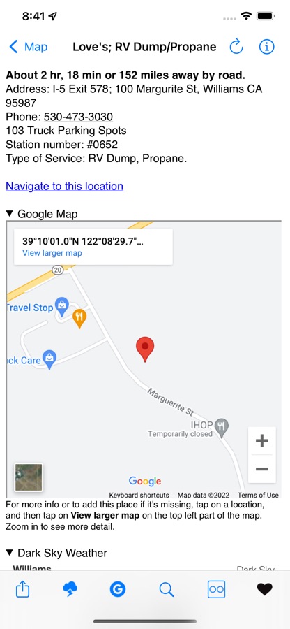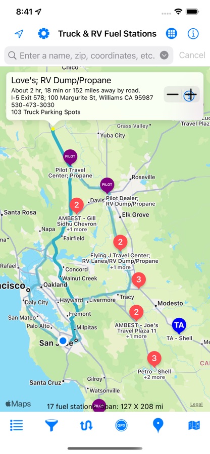 This app shows over 2,185 Loves, Petro, Pilot, Flying J, Travel America (TA), AmBest, Road Ranger, Maverik and Sapp Brothers fueling stations in the US and Canada.
