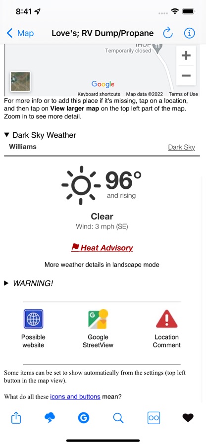 Also available with each location is the weather, Internet search of the location, and if available access to the companies’ web site.