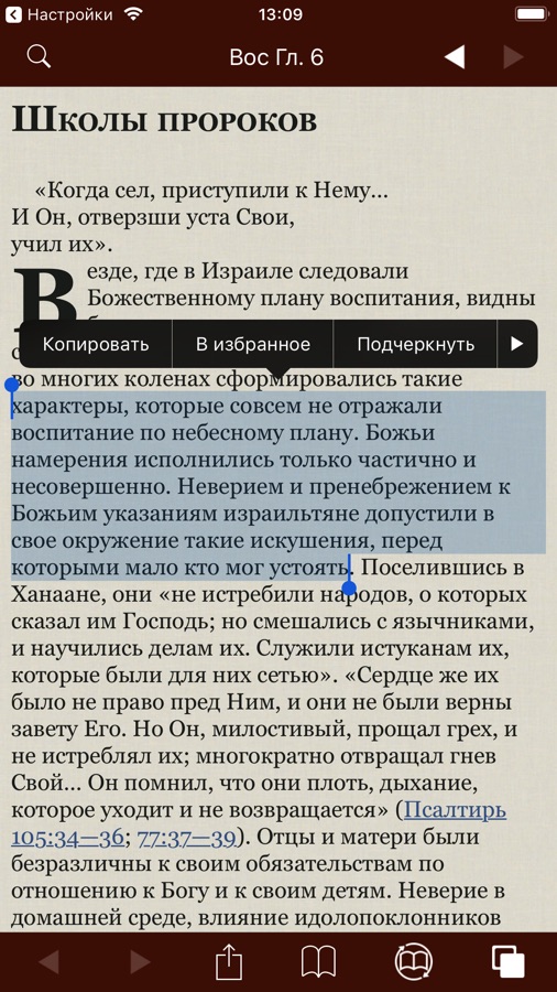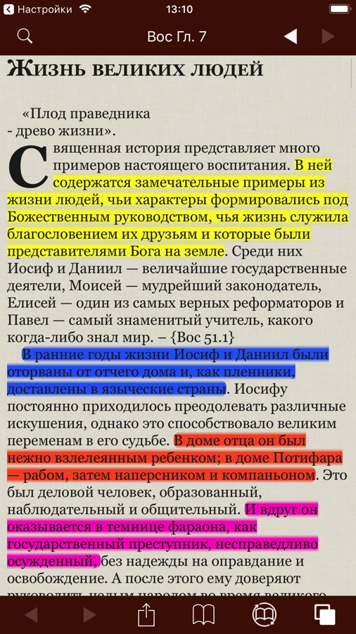 Возможно добавить закладки к любому стиху Библии или абзацу книг Елены Уайт