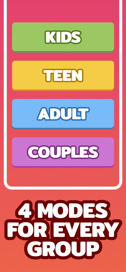 — 4 different game modes including Kids, Teens, Adult (18+) and Couples