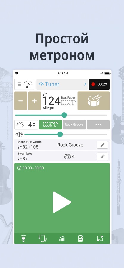 • Реальный метроном не должен отставать от ударов: наше приложение никогда не отстает