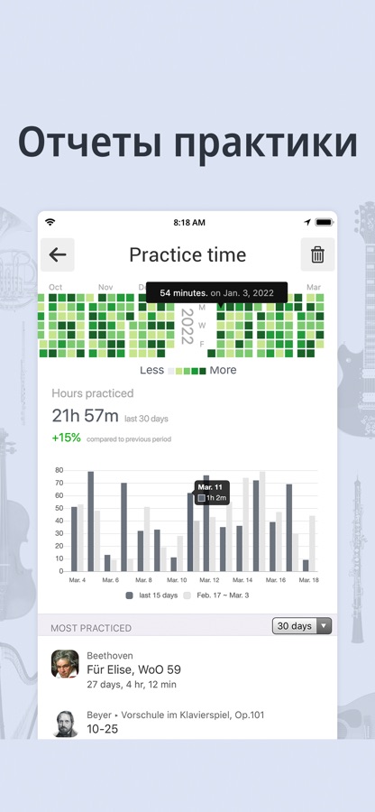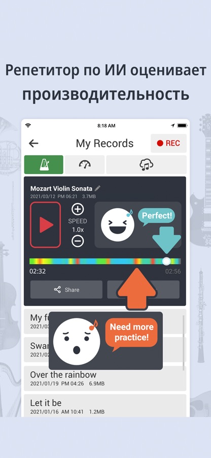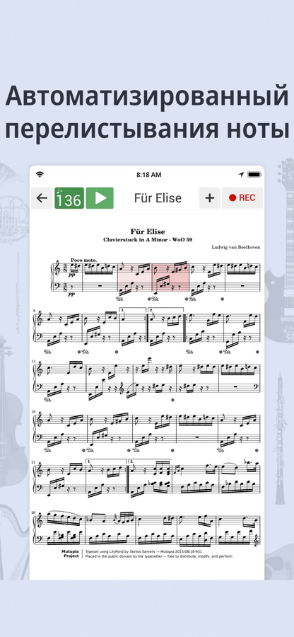 • Поддерживает все инструменты, с большим количеством активных пользователей фортепиано, гитары, укулеле, мандолины, скрипки, виолончели, альта, баса, барабана, флейты, гармоники!