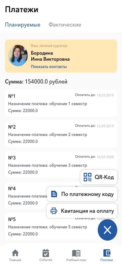 — в разделе «Платежи» знакомиться с графиком платежей за обучение, видеть историю своих платежей, а также производить оплату в самом приложении.
