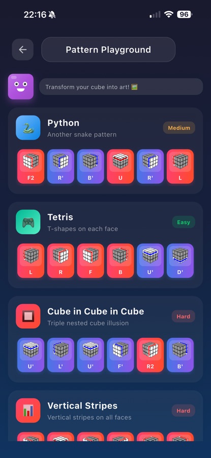 • Stunning Cube Patterns – Create amazing designs like Checkerboard, Superflip, and Cube in a Cube.