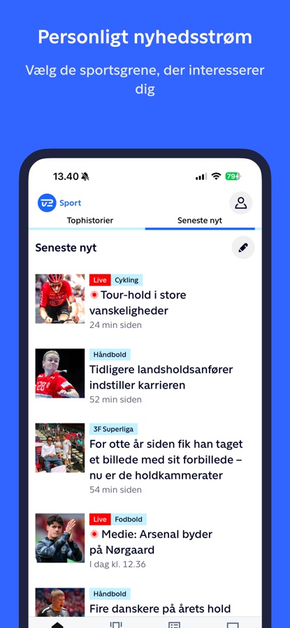 I sektionen ‘Seneste nyt’ kan du opsætte din egen personlige nyhedsstrøm med nyheder om de sportsgrene, du følger med i. Du kan tilvælge håndbold, fodbold, cykling, ishockey, basketball, badminton, tennis, motorsport, formel 1, e-sport og øvrig sport (dækker typisk svømning, atletik, golf, mm.).