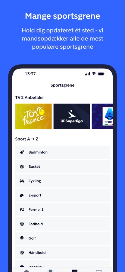 TV 2 Sport er en app, som du kan tilpasse præcis til dine behov. Du kan fjerne de sportsgrene, du ikke følger med i fra din egen personlige forside. Du kan også vælge præcis, hvad du ønsker at modtage push-beskeder om. Vælg mellem fodbold, håndbold, cykling, ishockey, basketball, badminton, tennis, Formel 1, anden motorsport og meget mere.