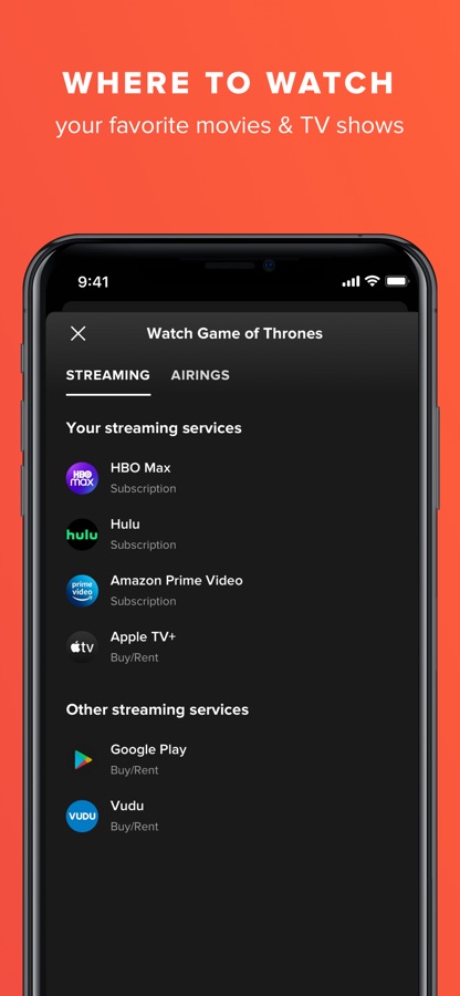 • QUICK WATCH: One-tap links to the best service (subscription, buy, or rent) to watch a show or movie, based on price, popularity, and your personal streaming subscriptions and live TV provider.