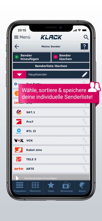 Mit einem Login in der KLACK App werden Ihre persönlichen Senderlisten von klack.de übernommen. So haben Sie Ihr persönliches TV-Programm auch direkt auf dem Handy und können schneller navigieren als bei TV Movie, TV Spielfilm oder TV Today.