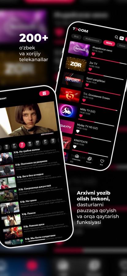 Окунитесь в мир развлечений! Смотрите ТВ онлайн, скачивайте любимые фильмы для просмотра без интернета, наслаждайтесь новинками кино и захватывающими спортивными трансляциями в прямом эфире. Популярные сериалы, яркие детские мультфильмы — всё в одном IPTV приложении! Безграничный просмотр ТВ и фильмов на русском и узбекском языках, никакой рекламы — только чистое наслаждение в кристальном FullHD и 4K качестве.