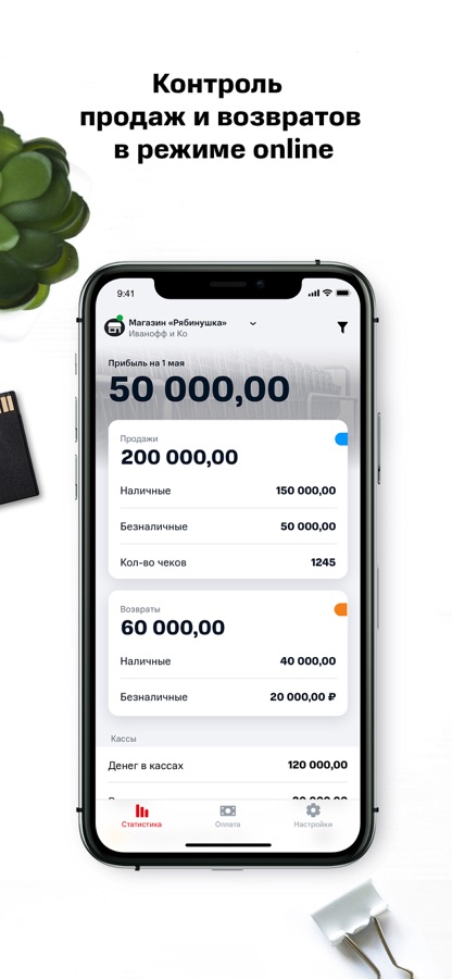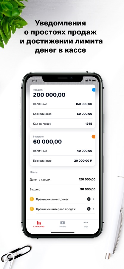Приложение дает возможность оперативно получать ключевые данные о продажах, не заходя в товароучетную систему. В 1 клик с экрана своего смартфона вы видите статистику по важным показателям: выручка, эквайринг, количество возвратов, средний чек и др.