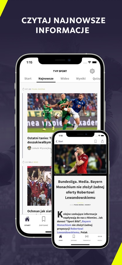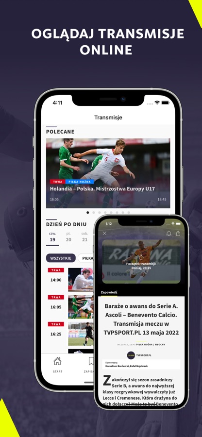 Telewizja Polska, jako oficjalny nadawca piłkarskich mistrzostw świata i Europy, igrzysk olimpijskich, udostępnia aplikację mobilną ze sportowymi treściami «na żywo», w której znajdziesz również wyniki oraz materiały wideo ze wszystkich interesujących Cię dyscyplin. M.in.:
