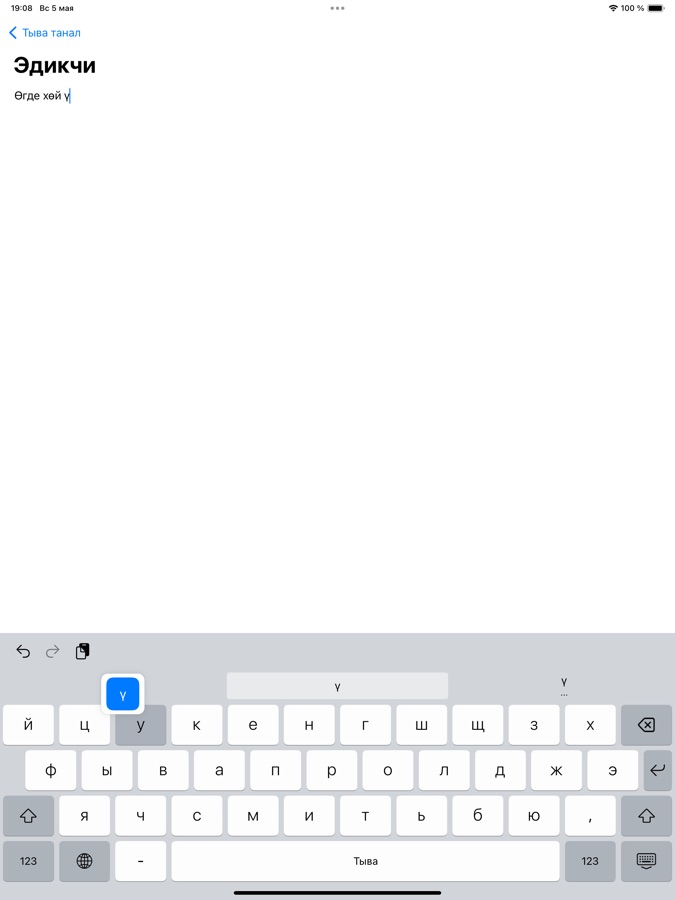 Вторая версия раскладки клавиатуры для тувинского языка под iOS. Содержит буквы «ӨҢҮ», а также «ЁЩЪ» под «ЕШЬ». Инструкция есть внутри. Есть настройки клавиатуры.