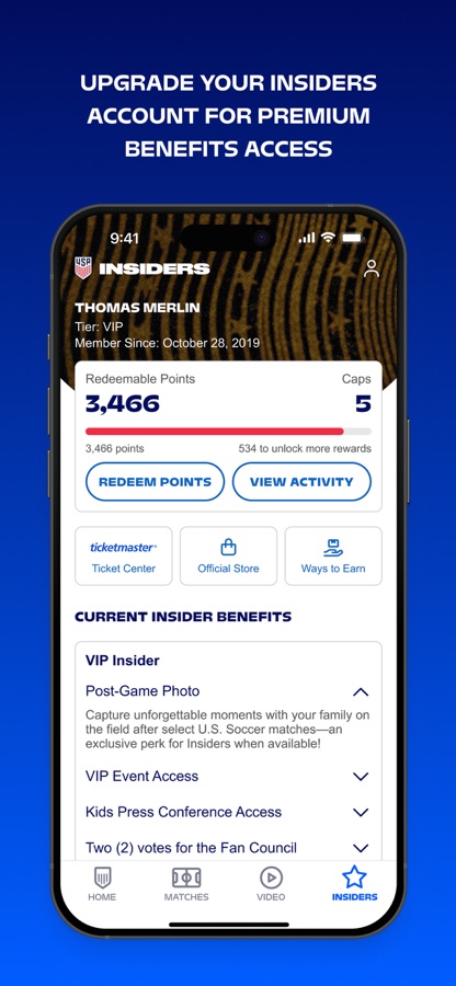 Join ‘Insiders Rewards,’ the Insiders loyalty program and earn redeemable points by interacting through the app and with U.S. Soccer.
