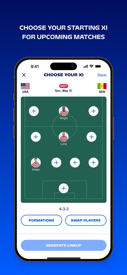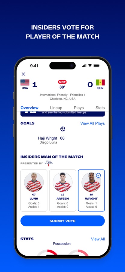 • Earn points by voting for the Player of the Match, watching featured videos, attending matches, purchasing items from the U.S. Soccer Store, choosing your starting XI and much more.