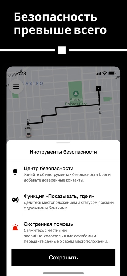 Если во время поездки возникнет чрезвычайная ситуация, вы сможете позвонить в местную экстренную службу прямо через приложение. Данные о поездке и вашем местоположении отобразятся на экране, чтобы вы могли быстро передать их оператору.