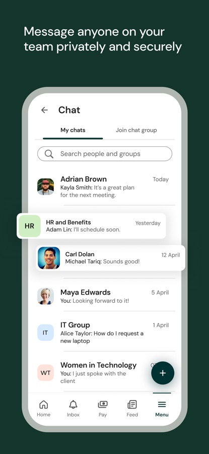 • Create and join employee resource groups focused on work, hobbies, interests, and more