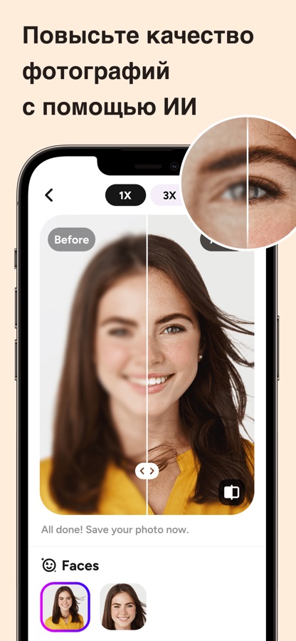 При помощи передовой технологии искусственного интеллекта, UpFoto мгновенно повышает качество ваших портретных фотографий, будь то 10 или 20 летний возраст, до уровня HD-селфи, сравнимого с качеством самых последних телефонов. Наслаждайтесь невероятной детализацией глаз и идеальной кожей всего за несколько секунд.