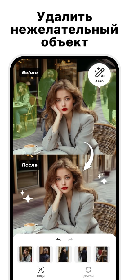 Улучшайте свои правки, удаляя беспорядок на фоне или усиливая фокус на ключевых элементах. Автоматически удаляйте объекты с помощью интеллектуальной идентификации AI, всего одно нажатие, чтобы удалить все, что вы хотите.