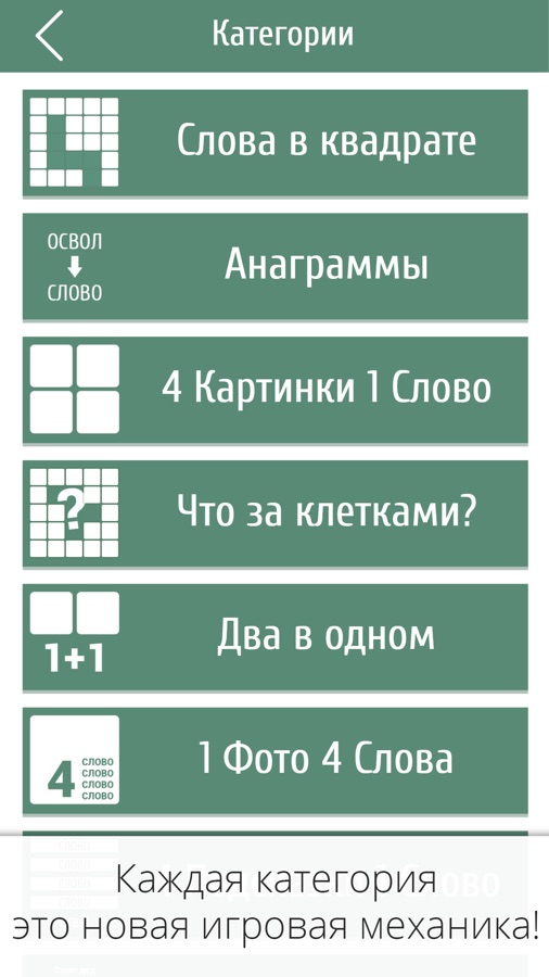 Игра Умные слова объединила в себе несколько игровых механик жанра «Словесные игры». Поэтому можно смело назвать её сборником словесных игр. Установив игру Умные слова, вы сможете попробовать такие игры как Найди слова, Анаграммы, 4 Картинки 1 слово, Что за клетками, Загадки, Два в одном, 1 Фото 4 Слова, 4 Подсказки 1 слово… И всё это в одной игре!