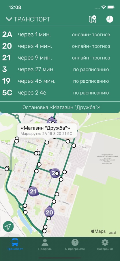 Раздел «Транспорт» показывает все городские автобусы и маршрутки, прогнозирует время прибытия на вашу остановку и покажет полное расписание.