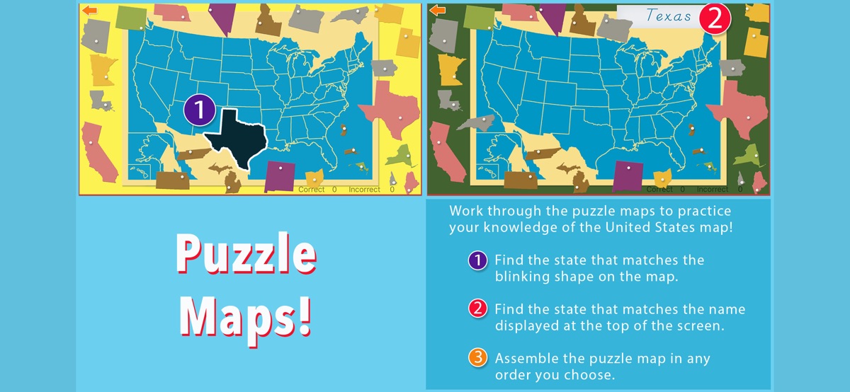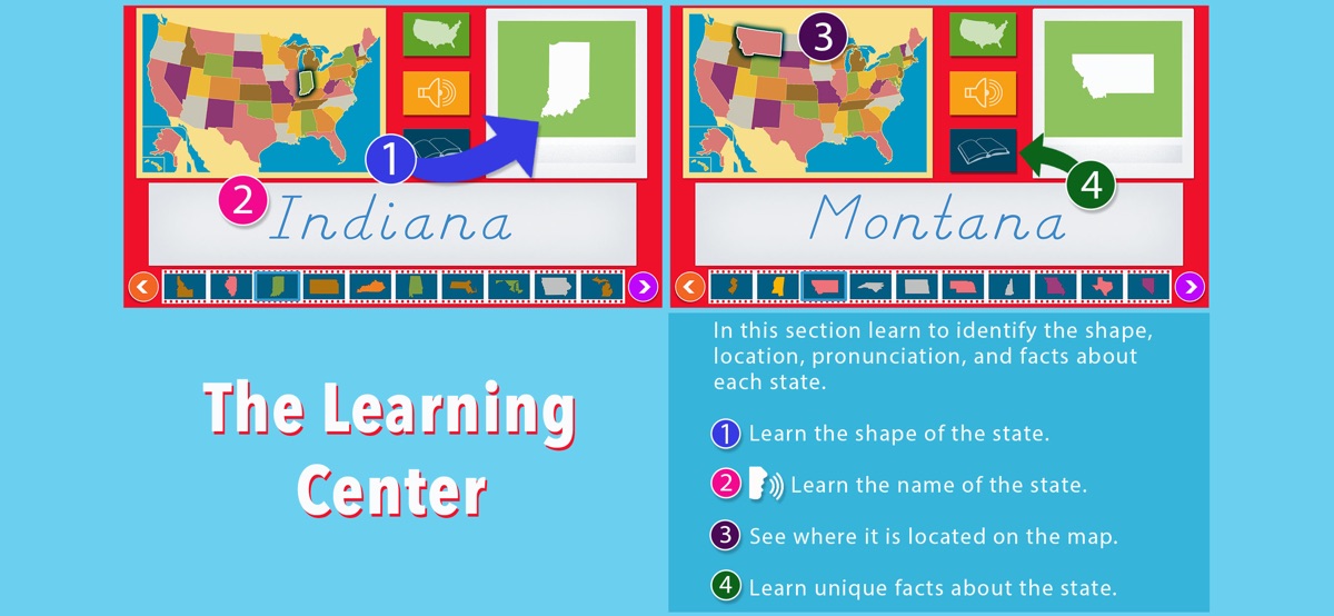 Ages 2 & Up. This app has been developed to include activities for children from preschool & kindergarten ages up to elementary school, to learn about the United States of America! Learn facts about each state, use the famous Montessori Geography Puzzle Maps, color in the states like a coloring book, and do «research» via the Mobile Montessori Worksheets!